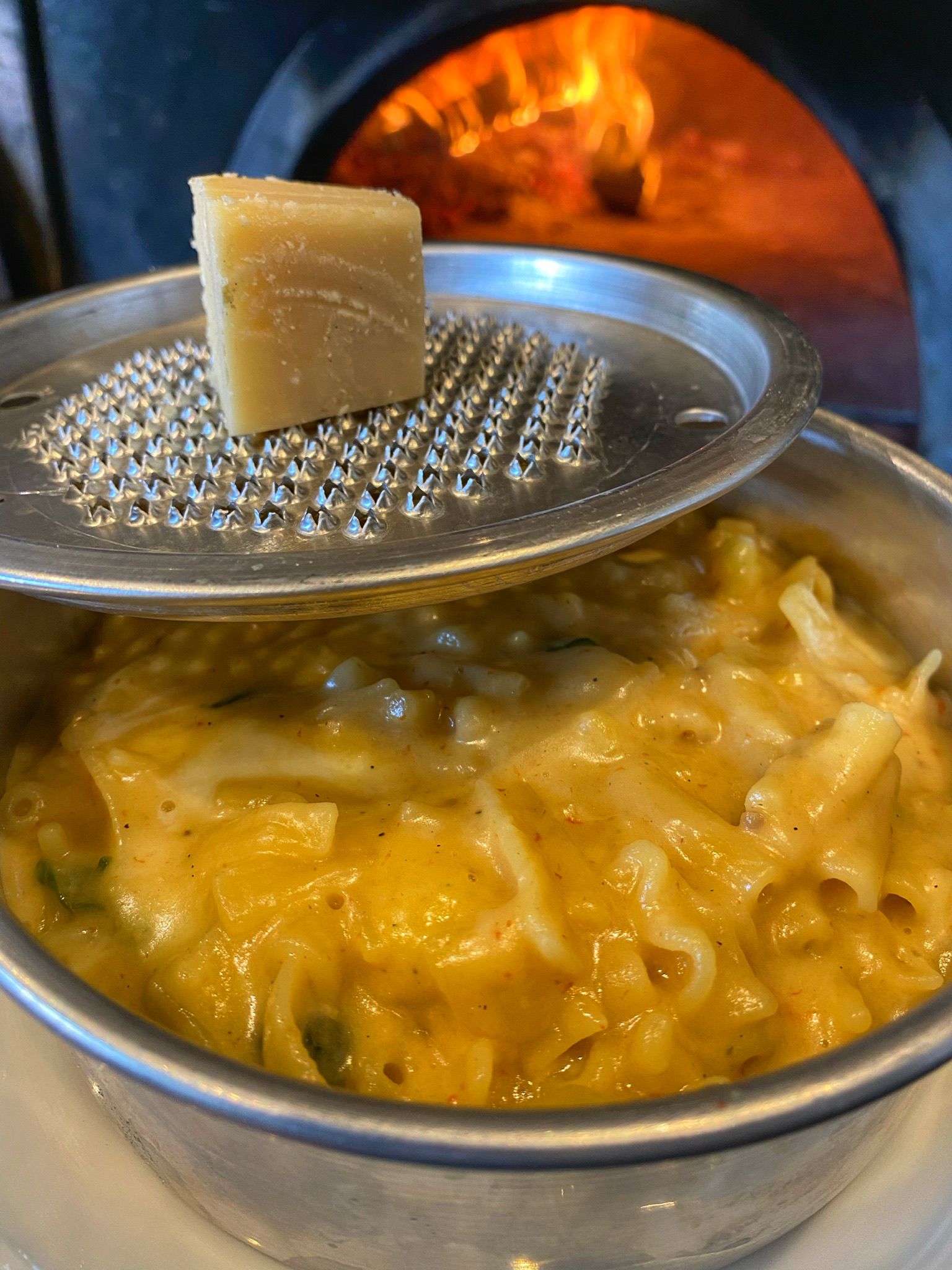 Un appetitoso zito spezzato a mano allo Scarpariello napoletano, servito in cesto di panpizza cotto al momento.